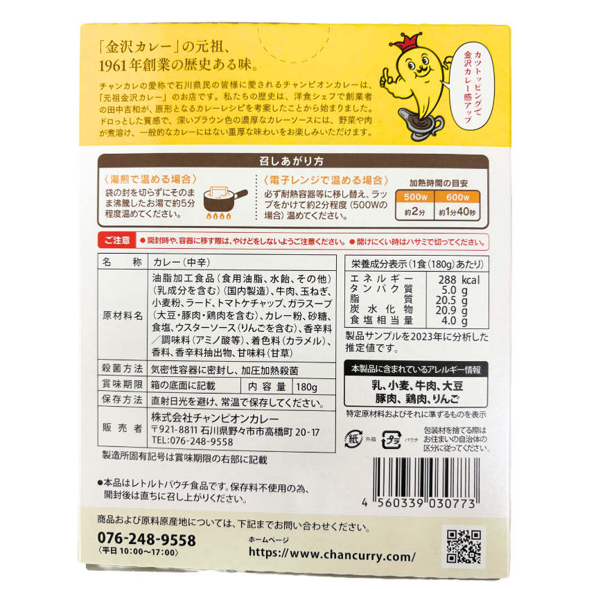 中身は、金沢カレーの元祖・チャンピオンカレーの定番「中辛」を使用。